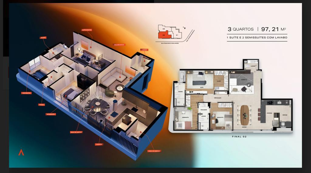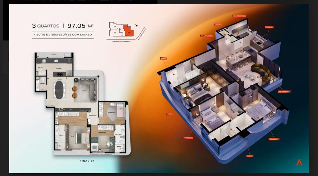 Venha conhecer e se encantar com mais um empreendimento da construtora Terrazzas, no bairro Anchieta. Apartamentos de alto luxo, 87,09 a 135,87m, de 2 ou 3 quartos, a 5 minutos da Savassi. Com lazer premium e inédito no rooftop, o Atmosfera Modern Residences possui toda infraestrutura para quem procura viver bem, com segurança e muita qualidade de vida. Torre única, 3 apartamentos por andar, com 2 semissuítes e lavabo, 2 elevadores, projeto paisagístico diferenciado, com espelho d'água, medidor de gás e água individualizados. No rooftop há confraria gourmet, terraço gourmet, fitness, piscina, playground, espaço kids.